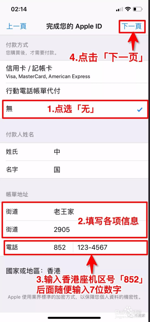 重点:付条目体例若是有【无】按钮,就点击无。我的手机是苹果国行6,没有【无】按钮,默认进来是两个付条目体例都没有选中,直接录入下面的信息即可。依次填写各项信息,接下来在【德律风】栏输入喷鼻港座机区号【852】,后面随便输入7位数字,然后点击【下一页】,接着点击继续按钮即可完当作完美信息的操作。