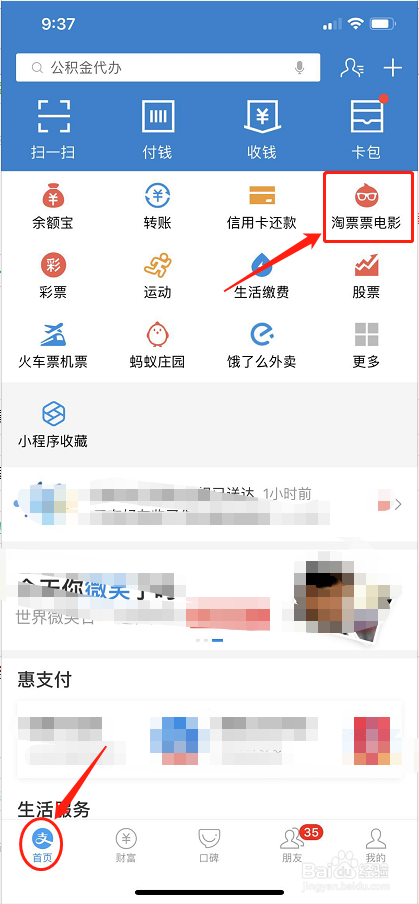 收到淘票票的片子票兑换码今后,打开支付宝,在“首页”找到“淘票票片子”;