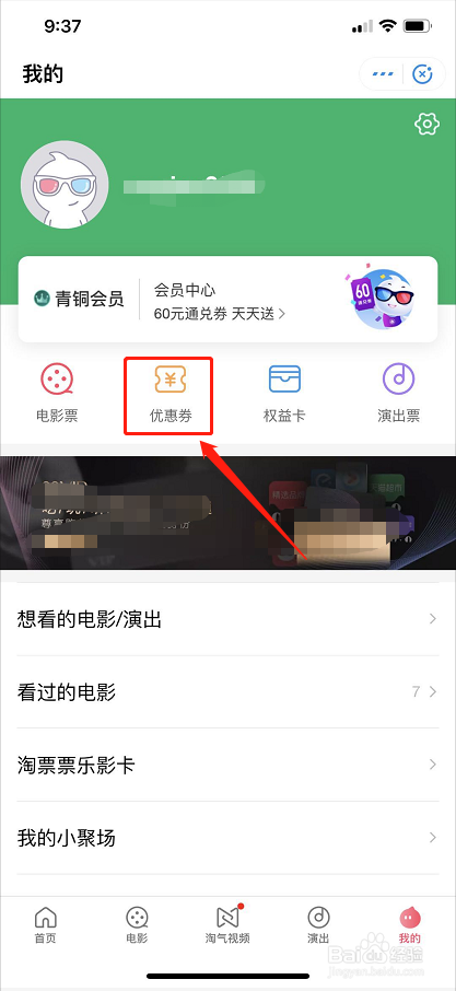 进入“淘票票片子”应用今后,在“我的”页面点击“优惠券”;
