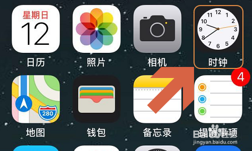 首先我们需要在苹果手机桌面找到“时钟”应用,见图一...所有版本的苹果手机都是自带该功能的;