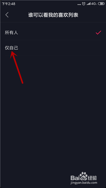 把这个选择为【仅本身】,设置好后返回抖音小我中间。