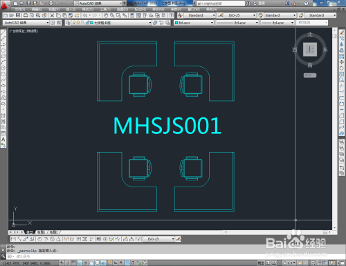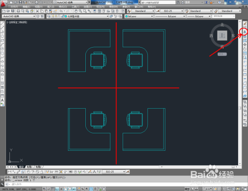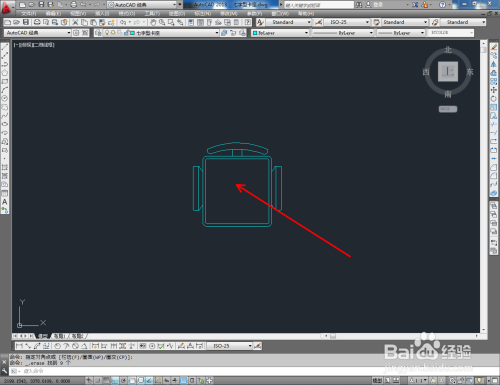 将我们建造好的转椅图块导入到文件中,按图示调整好转椅的位置和偏向。选中整个卡座,点击【镜像东西】对卡座进行镜像复制,这样我们的七字型卡座平面图便全数建造完当作。