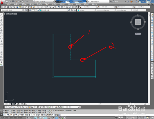 点击右边东西栏中的【圆角东西】,在号令栏中输入:r并按下空格键,输入数值:300后,鼠标点选图示图案上相邻两线,完当作图案的圆角处置(如图所示);