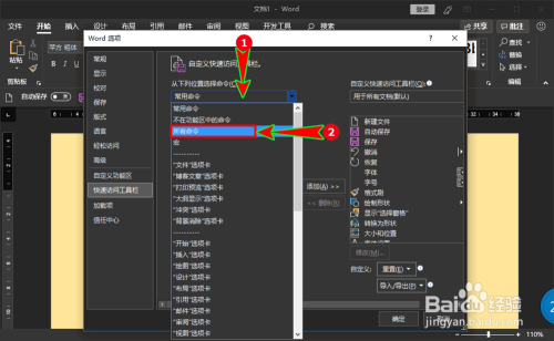 紧接着我们在右侧界面中点击“从下各位置选择号令”下方的方框,并在呈现的下拉菜单中选择“所有号令”,这样下方的风雅框内就会呈现所有东西清单。如图所示: