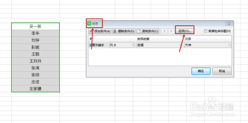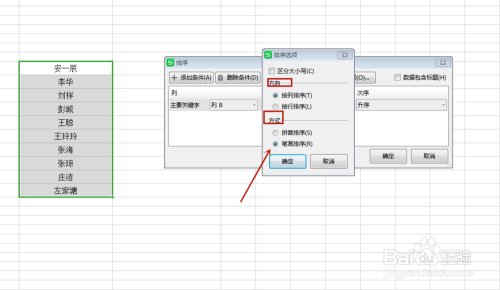 我们在排序选项对话框中,选择排序偏向为“按列排序”,体例为“笔画排序”,点击确定。