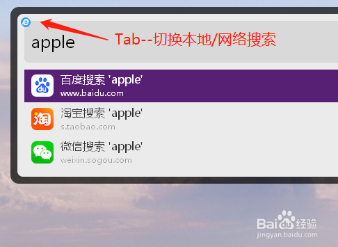 打开搜索框后,按Tab键,切换当地/收集搜刮。当搜索框左上角呈现蓝色的“e”字标记时为收集搜刮。此时当搜索框中输入搜刮词,回车之后,将以电脑默认的浏览器打开搜刮的成果,火萤酱默认环境下显示百度搜刮、淘宝搜刮和微信搜刮(搜狗搜刮),也可以本身设置分歧的搜刮引擎。