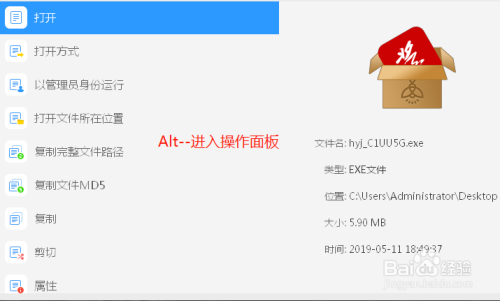 被选中要打开的文件或文件夹时,按Alt键,将进入该文件或文件夹的操作面板。在操作面板中,显示了其根基信息,还可以对其进行复制、剪切等操作。