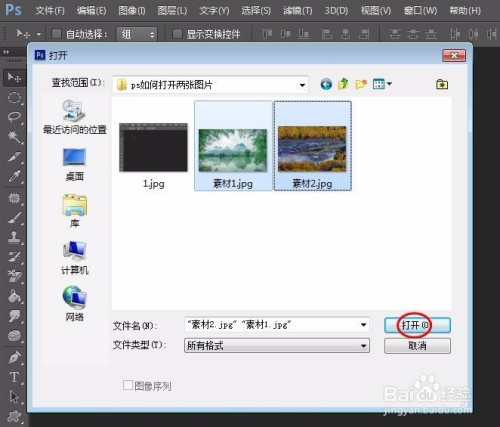 第二步:按住Ctrl键,鼠标左键单击两张图片,同时选中后单击“打开”按钮。