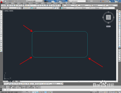 继续点击右边工作区中的【圆角】图标,在号令栏中输入:r并按下空格键,继续输入半径数值:50并按下空格键。鼠标依次点击矩形图案相邻的两条边线,完当作圆角处置。同样的步调,依次完当作别的三个角的圆角处置(如图所示);