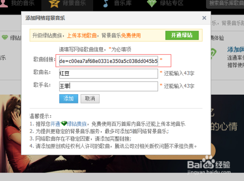 把在百度音乐获取到的链接,复制到相对应的链接的输入框上,输入上音乐名和歌手名。