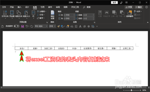 筹办好excel工资信息后,我们打开word软件,新建一个空白文档,然后将excel中工资表的表头内容复制到word文档中,复制好后可以临时封闭excel文档。