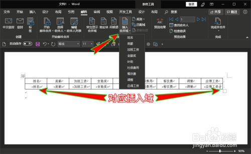 选好后,点击弹窗下方的“确定”按钮,接着在顶部“邮件”菜单下找到“插入归并域”选项,在word文档中的那个表格中的单位格内对应插入响应的域。