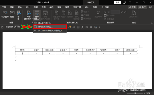 接着,我们继续在“起头邮件归并”选项组里点击“选择收件人”打开其下拉选项,然后选择里面的“利用现有列表”选项。