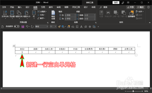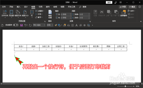 为了建造好后便于打印和裁剪,我们在表格下方的换行符处再敲下键盘上的回车键Enter新建一个换行,用于放置第二个工资条。