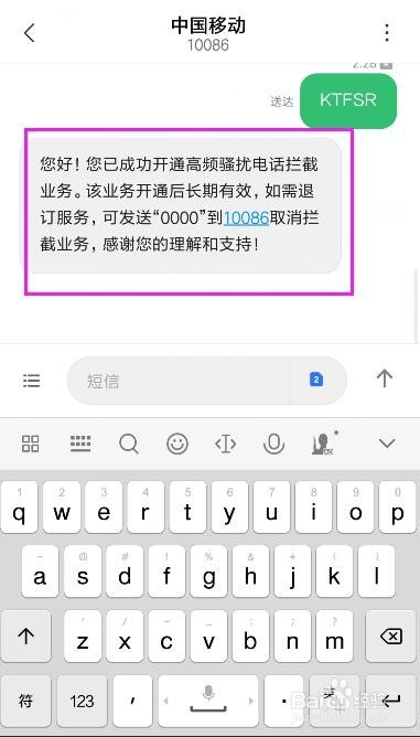 发送后,会呈现“送达”。接着,我们就能收到开通当作功的短信通知。若是想打消,就发送0000。开通后,就会帮我们阻挡失落那些德律风~