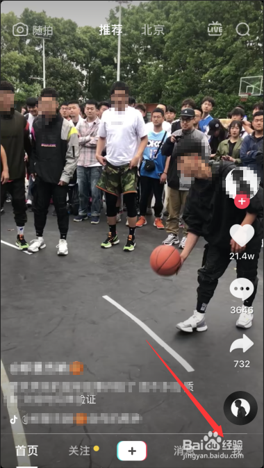 然后进入抖音的首页,也就是视频播放的页面,然后点击视频右下角的“我”,进入抖音小我中间,如图所示。