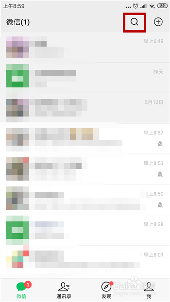 打开手机里的微信后点击右上角的【搜刮】选项,如图所示。