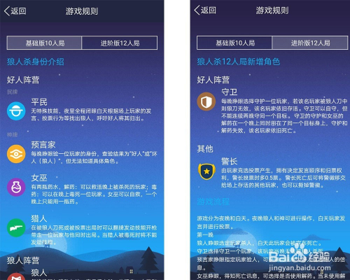 若是不懂的游戏法则也可以查看,根本版10人局和进阶版12人法则都有所分歧,并且每个脚色有分歧能力