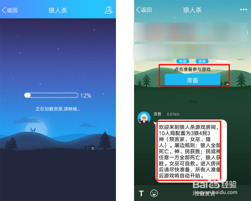 点击萌新区进入之后,会匹配四周有人在玩狼人杀,点击“筹办”,期待对方玩家筹办.