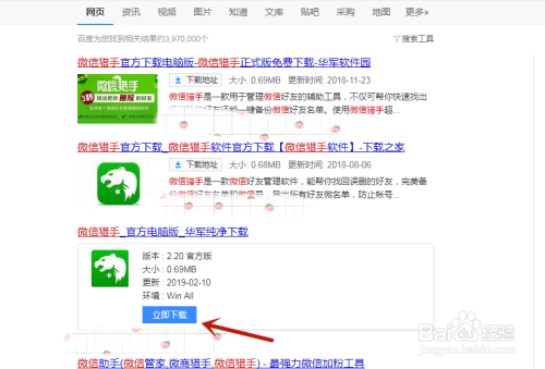 首先在百度搜刮中输入“微信猎手”,点击进行搜刮,找到需要下载的软件,进行下载。