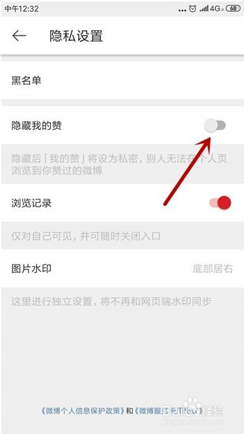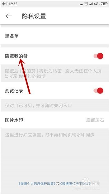 点击之后就打开了【埋没我的赞】功能,这样别人在我们的微博本家儿页是看不到我们点赞的微博的。