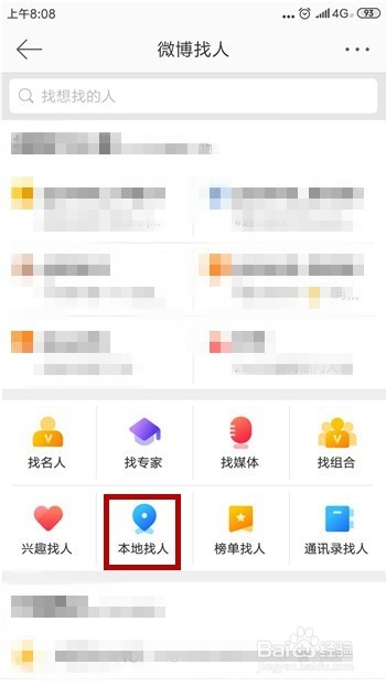 进入到微博找人后有个分类是【当地找人】,这样也可以找到四周的人。