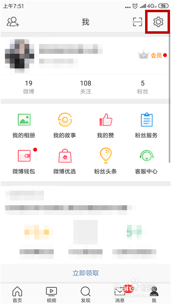 打开了的微博的小我中间后找到右上角的【设置】功能并点击打开。