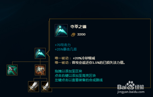 出有攻速、暴击装之后的话可以出无尽之刃。无尽可以增添暴击率以及提高时的暴击危险。当然也有人选择先出攻速暴击率的绿叉或者火炮。