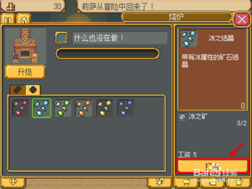 退出使命界面点击“熔炉”,注重熔炉上必需要有工人,点击冶炼图标,然后将采集到的矿石冶炼当作结晶,分歧属性矿石可冶炼当作分歧属性结晶。