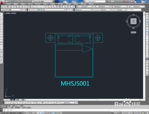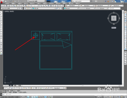 将我们建造好的床头柜平面图块导入到文件中,并按图示调整好床头柜与床的位置关系。选中床头柜,点击【镜像东西】进行镜像复制。到这里,我们整个双人床平面图便全数建造完当作。