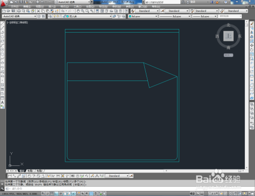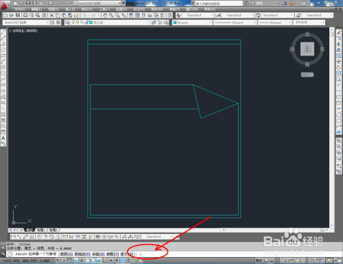 点击右边东西栏中的【圆角东西】,在号令栏中输入:r并按下空格键,继续如何数值:50并按下空格键确定,鼠标按图示拾取图案上相邻的两条线段进行圆角处置。同样的步调,完当作别的一边台角的圆角处置(如图所示);
