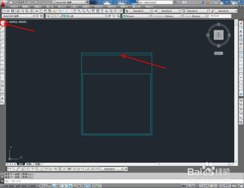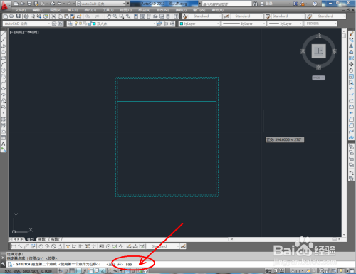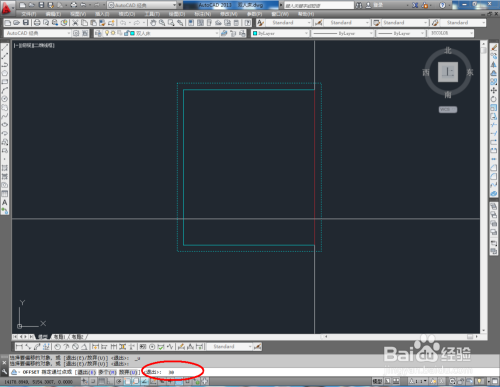 点击右边东西栏中的【偏移东西】,在号令栏输入数值:30,对矩形图案进行标的目的内偏移。完当作后,点击【延长东西】,按图示对图案进行500mm的延长操作。点击【直线东西】按图示进行线段弥补绘制(如图所示);