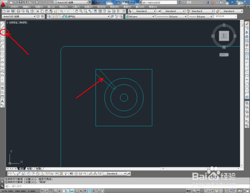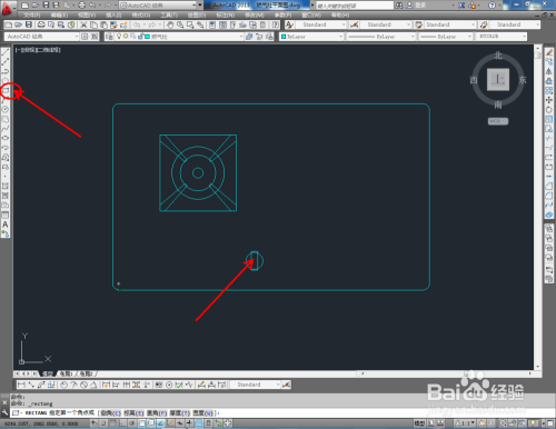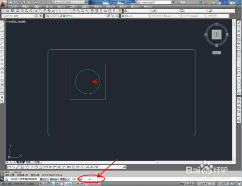 点击【矩形东西】,按图示绘制一个180*180mm的矩形图案后,点击【圆东西】,在矩形图案中绘制一个半径为62mm的圆形图案。点击右边东西栏中的【偏移东西】,按图示对圆进行两次偏移操作(如图所示);