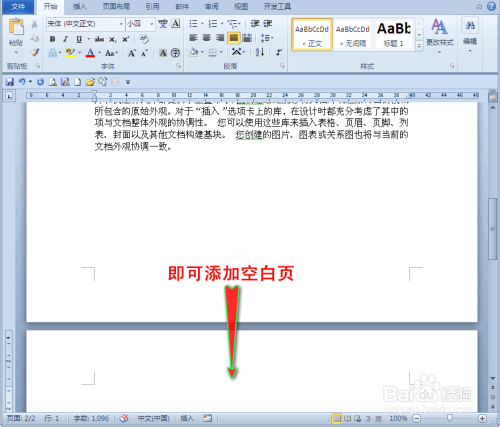 首先我们将鼠标定位在文档内容最末处,再单击键盘上的“Ctrl+Enter”键,即可在文档中添加空白页。如图所示: