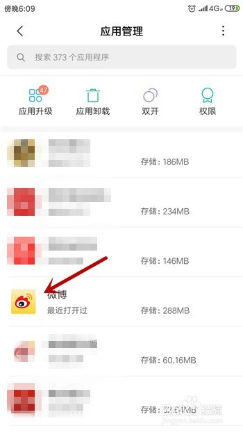 在应用里找到我们需要清理缓存数据的【微博】后点击打开。