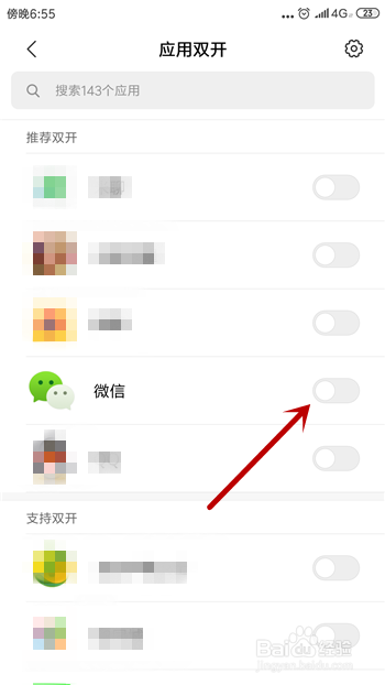 在应用双开中可以看到微信,我们需要点击微信后方的【开关】。