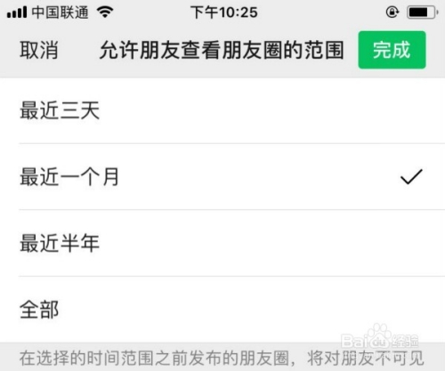 NO.5:界面跳转今后,选择比来一个月选项,点击完当作后,微信朋友圈一个月可见的设置就当作功了,微信老友就只能看到你比来一个月晒的内容了。