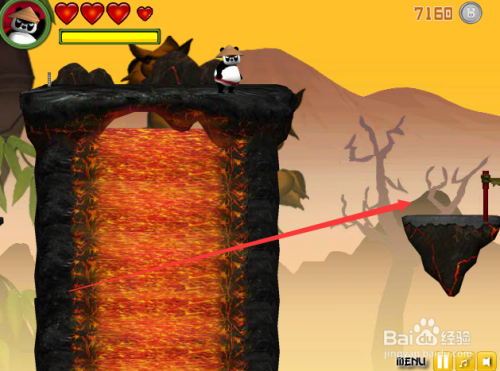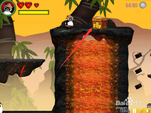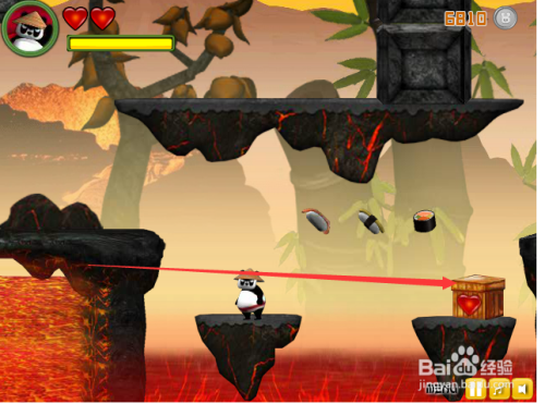 起头游戏后要快速的击败企鹅,一向往前冲,获得第一颗爱心,在这里必然要小心火,因为火很快速的移动。如下图