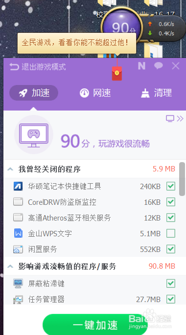第二个简单的法子,下载一个加快器,或者杀毒软件,打开游戏模式,加载一下,封闭不需要的后台程序