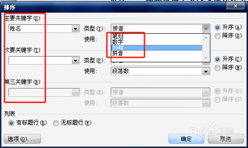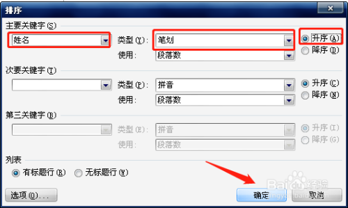 在“排序”对话框中,在本家儿要关头字下拉框中选择“姓名”,在类型下拉框中选择“笔划”,因为是笔划数从少到多进行排序,所以选择后面的“升序”选项。最后单击【确定】。