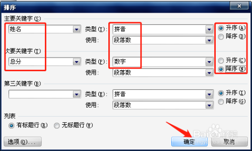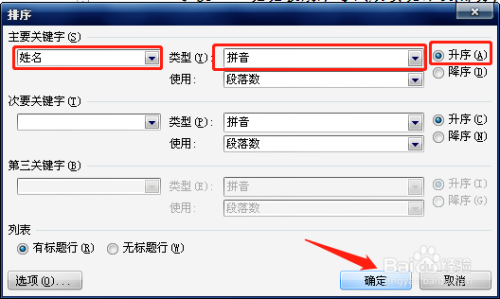在“排序”对话框中,在本家儿要关头字下拉框中选择“姓名”,在类型下拉框中选择“拼音”,因为是从A到Z进行排序,所以选择后面的“升序”选项。最后单击【确定】即可。