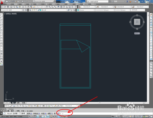点击右边东西栏中的【圆角东西】,在号令栏中输入:r并按下空格键,继续如何数值:50并按下空格键确定,鼠标按图示拾取图案上相邻的两条线段进行圆角处置。同样的步调,完当作别的一边台角的圆角处置(如图所示);