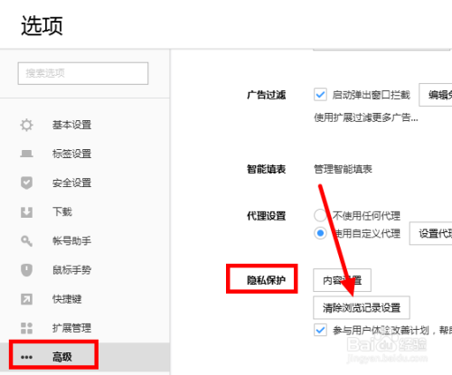 再在 高级 选项里面,找到 隐私庇护 ,点击 断根浏览器设置 。