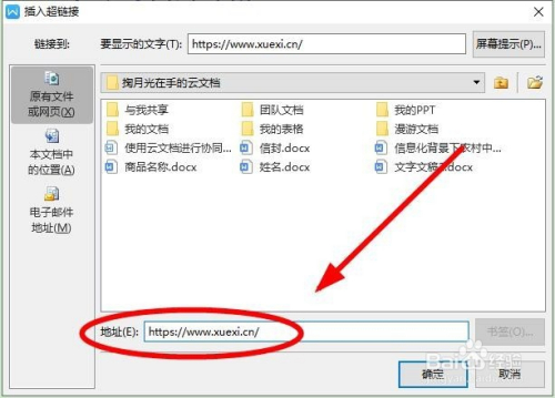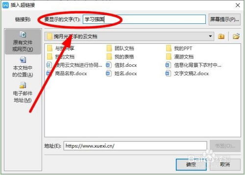 在弹出的“插入超链接”对话框中的“地址”位置输入“学习强国”网址