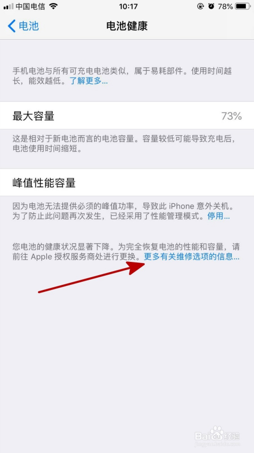 若是电池容量很低,我们可以选择进行改换和维修,在这里点击“更多有关维修选项的信息”,如下图