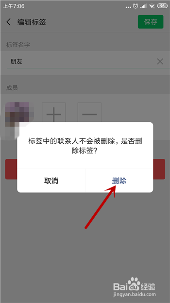 删除标签时会提醒我们不会删除标签中联系人,是否确认删除,点击【删除】。