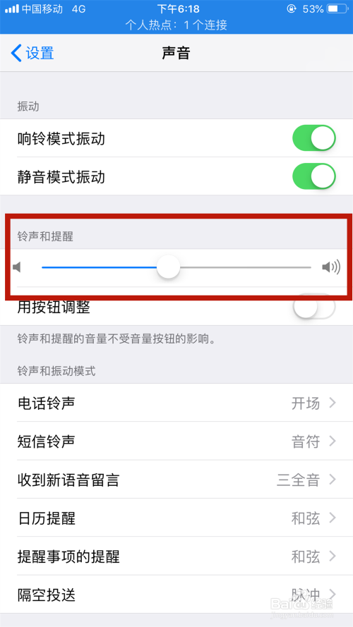 在声音页面看到“铃声和提醒”,看这里是不是被关失落了,若是被关失落的话,那么把它设置到合适的声音大小即可