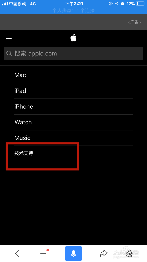 打开Safari,打开苹果中国官网,点击左上角功能栏中的手艺撑持
