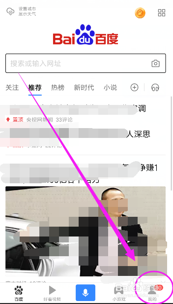 来到我们的手机百度首页,点击右下角的我的选项,如图所示