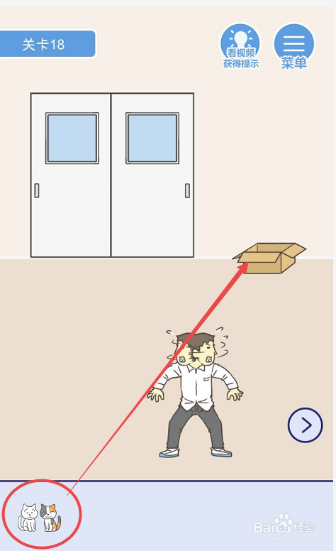 之后小猫就会显示在道具栏内,点击左侧的箭头,显示左侧的地图,可以看见左侧也有一个纸箱子,点击小猫然后移至小箱子处。
